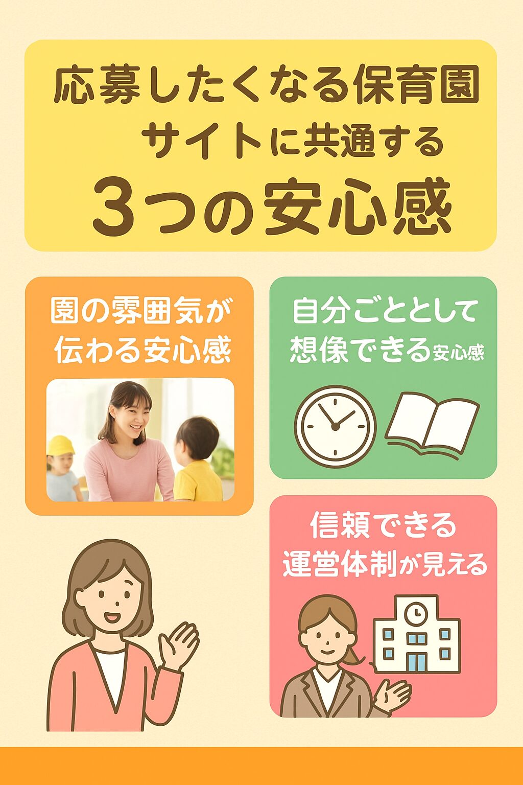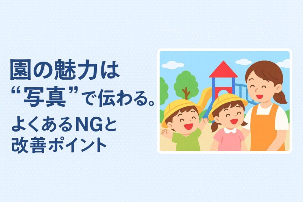 園の魅力は“写真”で伝わる 保育園や幼稚園のホームページにおいて、写真は施設の第一印象を決定づける要素です。どれほど素晴らしい保育内容や設備が整っていても、それを伝える写真が適切でなければ、保護者に十分な魅力が届きません。実際に写真を改善しただけで、見学希望者や入園希望者が増えたというケースも多くあります。 なぜ写真が重要なのか 言葉では伝えきれない園の雰囲気や安心感は、視覚情報である写真によって直感的に伝えることができます。保護者は、子どもがどのような環境で過ごすのかをイメージした上で入園先を選びます。そのため、温かさや清潔感、楽しそうな雰囲気が伝わる写真が重要です。 よくあるNG写真 暗くてブレている 背景に不要な物が写り込んでいる 子どもたちの表情が硬い・無理にポーズをとっている 上記のような写真は、園の本来の魅力を伝えるどころか、逆に不安を与えてしまうことがあります。 改善のポイント 自然な保育風景を撮影することが基本です。子どもたちが自由に遊んでいる様子、先生とふれあう様子など、ありのままの姿を切り取ることが大切です。また、明るい場所で撮影する、背景を整理するなどの工夫も効果的です。 ポイント3つ 明るく自然な光のもとで撮る 背景に余計なものを写さない 子どもの自然な笑顔を狙う プロに頼むメリット プロのカメラマンに依頼することで、構図・光の使い方・子どもの表情の引き出し方において格段に質が向上します。一度の撮影で、年間を通じて使用できる豊富な素材が揃い、ホームページの品質そのものが高まります。 写真で変わった園の反応 実際に、写真を変更しただけで保護者からの印象が良くなり、県外からの問い合わせや求人応募が増えた園もあります。特に保育士採用のページでは、写真の雰囲気によって応募者が「この園で働いてみたい」と感じることも少なくありません。 ホームページでの見せ方 トップページだけでなく、「園の紹介」「保育内容」「年間行事」などのページでも写真を効果的に使うことで、園の個性が伝わりやすくなります。1ページに1〜3枚程度の写真を入れると、テキストとのバランスも良くなります。 よくある質問 Q. スタッフがスマホで撮ってもいい? A. 明るい場所や構図を意識すれば可能です。ただし画質には限界があるため、印象を重視するページではプロ撮影をおすすめします。 Q. 写真はどのくらいの頻度で更新すればいい? A. 年に2〜3回でも新しい写真を追加することで、園の活動が継続している印象を与えられます。 Q. 保護者の同意はどうしてる? A. 入園時に撮影の可否を確認し、同意書を取っておくことで、ホームページへの掲載がスムーズに行えます。 まとめ 園の魅力を伝えるために、まずは写真を見直すことが大切です。どんなに素晴らしい内容でも、伝わらなければ選ばれません。見学前にホームページを見ている保護者にとって、写真は“園を選ぶ理由”になることを意識しましょう。