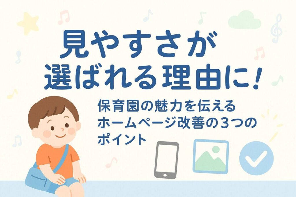 見やすさが選ばれる理由になる 保育園や幼稚園のホームページは、保護者が園を選ぶ際の大切な判断材料となります。特に初めての入園を検討している保護者にとって、サイトの第一印象は大きな意味を持ちます。文字が読みやすく、情報が整理されているホームページは、それだけで安心感や信頼感を与えることができます。 現代の保護者は、スマートフォンで検索して情報を収集する傾向があります。そのため、園の情報がわかりやすく整っているかどうかが、実際の見学や問い合わせの有無に直結するケースもあります。園の魅力が伝わる写真や、保育理念、施設の紹介がきちんと掲載されているホームページは、選ばれる園づくりの大きな一歩になります。 わかりにくいホームページの特徴 実際にリニューアルをご相談いただく中で、「見たい情報がどこにあるかわからない」「スマートフォンで見ると文字が小さくて読みにくい」「写真が少なくて園の雰囲気が伝わらない」といった声をよくお聞きします。 古いデザインで情報が詰め込まれている、スマートフォンでの表示に対応していない、レイアウトが崩れていて必要な情報が探しにくいといったホームページでは、保護者が途中で閲覧をやめてしまうことも少なくありません。これではせっかくの園の魅力も伝わりにくく、見学の機会を逃してしまう可能性もあります。 改善のポイント3つ 1. 写真で園の雰囲気を伝える 文章よりも写真の方が園の雰囲気を直感的に伝えることができます。最近ではプロのカメラマンによる撮影を取り入れる園も増えており、園児たちの自然な笑顔や保育の様子を写真で見せることで、より信頼感を高めることができます。 また、写真だけでなく動画を用いて、園内の活動や先生たちの様子を紹介することで、保護者により深く園の雰囲気を伝えることができます。ホームページを開いた瞬間に流れる動画がきっかけで、見学や問い合わせにつながったという事例も少なくありません。 2. 保護者が知りたい情報を整理する 入園案内や料金、見学予約の方法など、保護者が特に気にする情報はトップページやメニューにしっかり掲載することが大切です。また、更新頻度が高いお知らせや園だよりなどは、園で簡単に更新できる仕組みにしておくと、常に新しい情報を発信できます。 弊社では、WordPressをベースに、先生方が簡単に使える更新システムを構築しています。特別な知識がなくても「文章の入力」「写真の追加」ができるので、忙しい先生でも安心して使っていただけます。 3. スマートフォンでの見やすさを意識する スマートフォンでの閲覧を前提としたデザイン設計を行うことで、保護者が外出先からでもストレスなく情報を確認できるようになります。文字の大きさやボタンの押しやすさも重要なポイントです。 スマートフォンからのお問い合わせや、園見学予約が簡単にできるような導線を設けることで、問い合わせ率がアップした園もあります。見やすい、使いやすいデザインは、実際の行動につながるきっかけにもなります。 リニューアル後の反響とデータ 実際にホームページをリニューアルしたある園では、サイト公開後に採用や入園に関する問い合わせが急増しました。 例えば、これまで求人情報をホームページに掲載していなかったところ、新たに「採用情報」ページを設けたことで、2か月で3名の面接希望者がありました。その中には、仙台に縁のなかった学生がホームページを見て「ここで働きたい」と千葉から面接に来たという事例もあります。 また、保護者からの反響として、「見やすくなった」「先生たちの雰囲気が伝わって安心した」といった声が寄せられ、県外からの入園希望者だけでなく、アメリカからの問い合わせもあり、実際に入園に至ったケースもありました。 ブログ機能やAI活用について ホームページの情報発信を続ける中で、「忙しくてなかなかブログが書けない」「何を書いてよいかわからない」といった声もあります。 そこで弊社では、あらかじめ決めておいたテーマをもとにAIが自動執筆してくれる「AIブログ機能」をご用意しています。先生方が月に1記事ほど執筆いただければ、他の週はAIが園の特色に合わせてブログ記事を自動で作成・投稿してくれるため、継続的な情報発信が可能になります。 よくある質問 Q. 自園で文章や写真の更新ができるか不安です。 A. 更新頻度が高い部分については、操作が簡単な仕組みをご用意しています。お知らせや園だよりなどは、先生方でも簡単に更新できるように設計しています。 Q. 専門的な知識がなくても大丈夫でしょうか? A. デザインや設定はすべてこちらで行いますので、難しい操作は必要ありません。必要な文章や素材はインタビュー形式でヒアリングすることも可能です。 Q. ホームページ以外にSNS連携も可能ですか? A. 可能です。公式SNSと連携し、最新情報が同時に発信される仕組みも構築できます。 まとめ ホーム